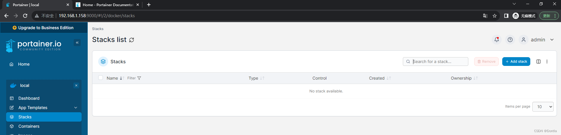 Stacks界面(用于管理和部署Docker Compose或Kubernetes的堆栈)
