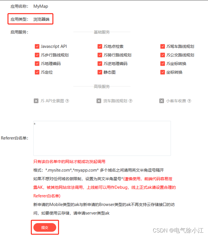 首先打开百度地图开放平台->进行注册登录->选择控制台->应用管理->我的应用->创建应用(如下图)->提交后获取应用AK(后面生成的HTML文件需要使用)