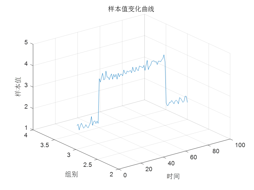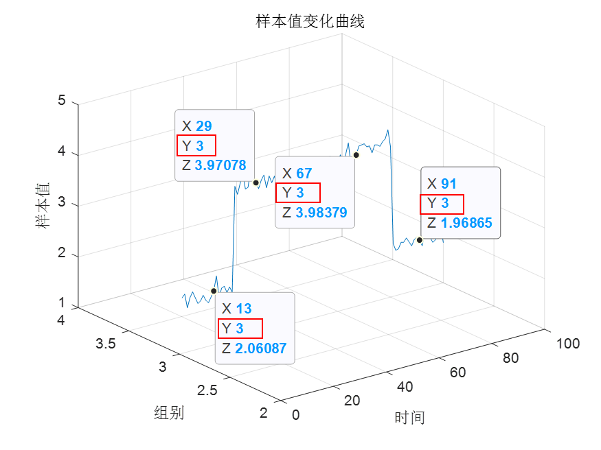 在绘制图象时我是这样理解:(x,y,z)对应着空间中的每个点,在绘图时,先将Y轴全部视为某一常数值,然后再将X轴视为自变量,Z轴视为因变量,这样的话,plot3(x,常数值,z)实际上与plot(x,y)函数的使用方式是一样的了。下面这张图是将Y向量全部赋值常数3(即第3组),X向量取值1:100,Z向量取X对应的样本值。