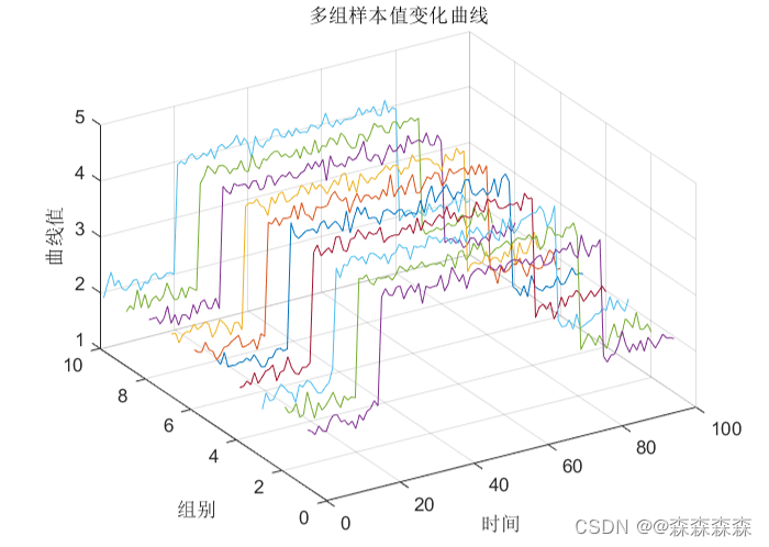 %% 绘制三维图像figure(1);for Group_Num = 1:10 x = 1:100; % 数据长度为100,将全部显示出来 y = Group_Num * ones(size(x)); % 共10组数据(组别号:1:10) z = Data(Group_Num, 1:100); % 每组数据的曲线值 plot3(x,y,z); % 绘图 hold on; % 保持endgrid on; title(['多组样本值变化曲线']);xlabel("时间");ylabel("组别");zlabel("曲线值"); 运行结果如下所示: