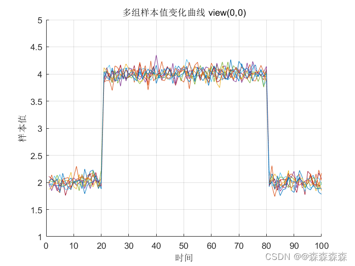 clc;clf;close;clear;%% 产生数据源 Data% 待显示数据的大小:20组数据样本,每组样本100个数据Data = zeros(20,100); % 为待显示数据(Data)赋值,自定义曲线t = 1:100;for i = 1 :10 Noise = randn(1,length(t))*0.1; %生成随机噪声 Data(i,:) = [ones(1,20)*2 ones(1,60)*4 ones(1,20)*2] + Noise; end 然后对Data中的数据进行绘图(核心代码):