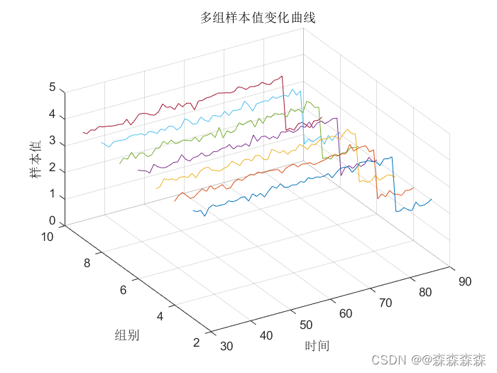 clc;clf;close;clear;%% 产生数据源 Data% 待显示数据的大小:20组数据样本,每组样本100个数据Data = zeros(20,100); % 为待显示数据(Data)赋值,自定义曲线t = 1:100;for i = 1 :10 Noise = randn(1,length(t))*0.1; %生成随机噪声 Data(i,:) = [ones(1,20)*2 ones(1,60)*4 ones(1,20)*2] + Noise; end%% 绘图代码优化%---3D图中显示数据的起始点---Range = [20,90]; %---导入数据量的组别范围---Number = [3,9] ;%---三维样本值变化曲线---%figure(2);for Group_Num = Number(1) : Number(2) x = Range(1) : Range(2); y = Group_Num*ones(size(x)); z = Data(Group_Num, Range(1):Range(2) ); plot3(x,y,z); hold on;endgrid on; %---3D图中数据值显示范围---zlim([1,5]); title(['多组样本值变化曲线']);xlabel("时间");ylabel("组别");zlabel("样本值"); 下图为选取第3组至第9组样本,每组只显示第30到90数据点的结果。