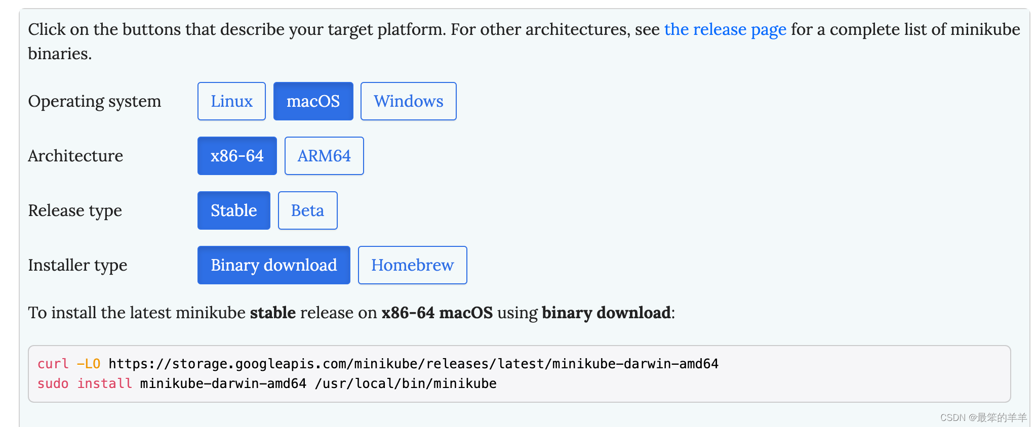 2 个或更多 CPU2GB 可用内存20GB 可用磁盘空间网络连接容器或虚拟机管理器,例如:Docker、QEMU、Hyperkit、Hyper-V、KVM、Parallels、Podman、VirtualBox 或 VMware Fusion/Workstation六、Mac安装minikube