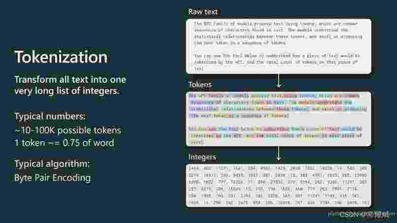 第一步:转换为计算机可以计算的向量Token。中文的每个字,被理解为是文本的一个基本单位,翻译成不同的token。是指将输入文本分解为更小的单位,例如单词、字母或字符。在自然语言处理中,将文本分解为标记有助于模型理解语义和语法结构。当一个Prompt被发送给GPT时,它会被分解成多个Token,这个过程被称为Tokenier。短单词可能每个词是一个token,长单词可能被拆成多个token。每个token会被用一个整数数字表示,这个数字被叫做token ID。这是因为,计算机内部是无法储存文字的,任何字符最终都得用数字来表示。有了数字表示的输入文本后,再把它传入嵌入层。如下是官网提供的Tokenization示意图。
