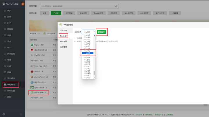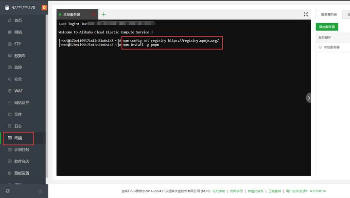 如果安装不上pnpm,是宝塔默认淘宝源已经无法使用,打开命令控制台,切换为官方源,单独安装pnpm模块 先设置npm为官方源:
