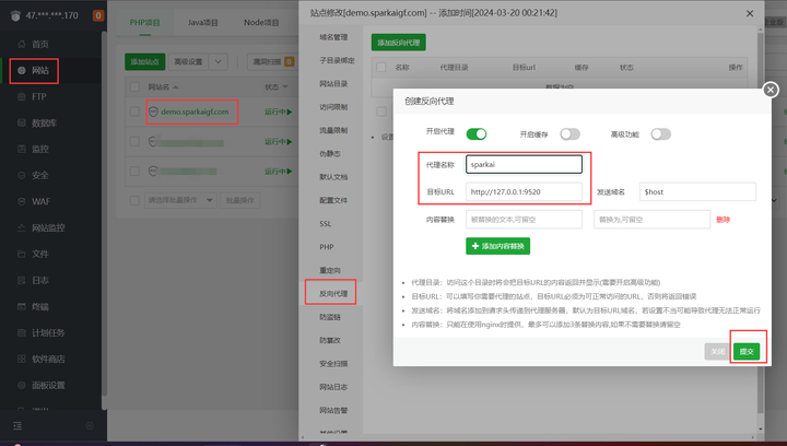添加站点 9520 端口,宝塔安全需要开启该端口,不然无法访问