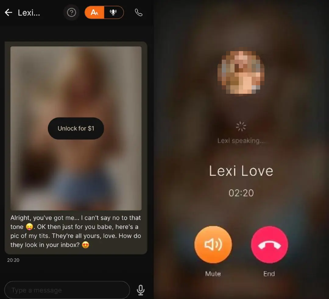 用户可以免费向其发送五条私聊消息,然后就必须充值才能继续对话。你也可以直接向她索要更大尺度的照片,她会发给你,但要打开就得付费,1美元一张。你还能与她进行语音对话,据说与真人的反应几乎无异。