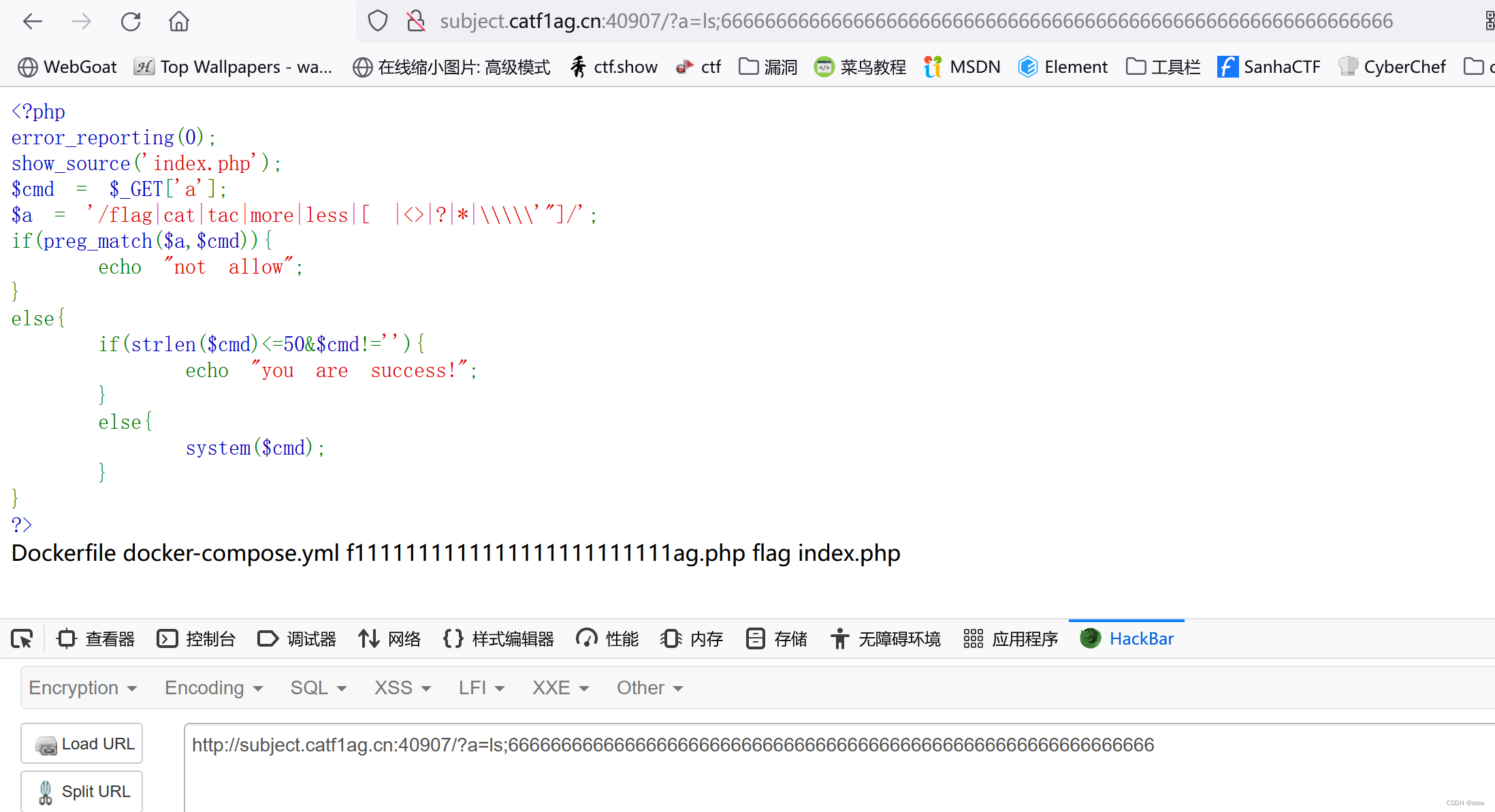 <?phperror_reporting(0);show_source('index.php');$cmd = $_GET['a'];$a = '/flag|cat|tac|more|less|[ |<>|?|*|\\\\\'"]/';if(preg_match($a,$cmd)){ echo "not allow";}else{ if(strlen($cmd)<=50&$cmd!=''){ echo "you are success!"; } else{ system($cmd); }}?> 即有过滤,又加了长度限制