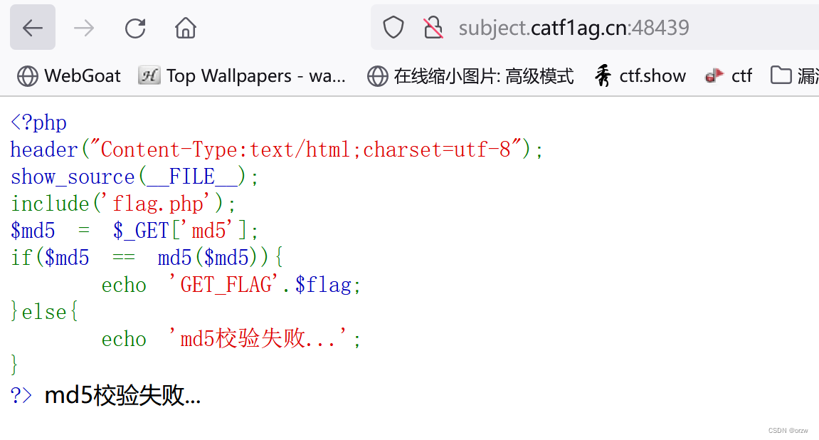 <?phpheader("Content-Type:text/html;charset=utf-8");show_source(__FILE__);include('flag.php');$md5 = $_GET['md5'];if($md5 == md5($md5)){ echo 'GET_FLAG'.$flag;}else{ echo 'md5校验失败...';}?> 一般的md5绕过是传入0e开头的md5值,因为在弱比较时,弱比较中会截取一个字符串的数字,知道遇到字符截止,对于0e+数字的值只会截取e之前的0,所以这里即便是令传入的md5值等于$md5后还需要等于其自身进行md5的值,我们选取0e或者加密后仍为0e开头的数就行例如:0e215962017 、以及这些纯字符串转化后为0e+数字的数:QNKCDZO、s878926199a