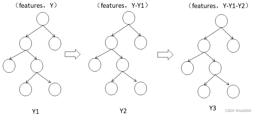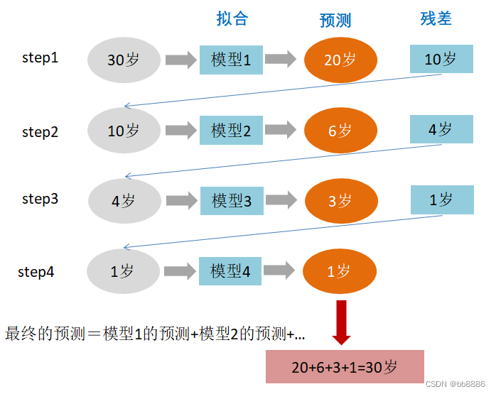 每一个后续的模型都会去把前一个模型没有拟合好的残差重新拟合一下。用下一个弱分类器去拟合