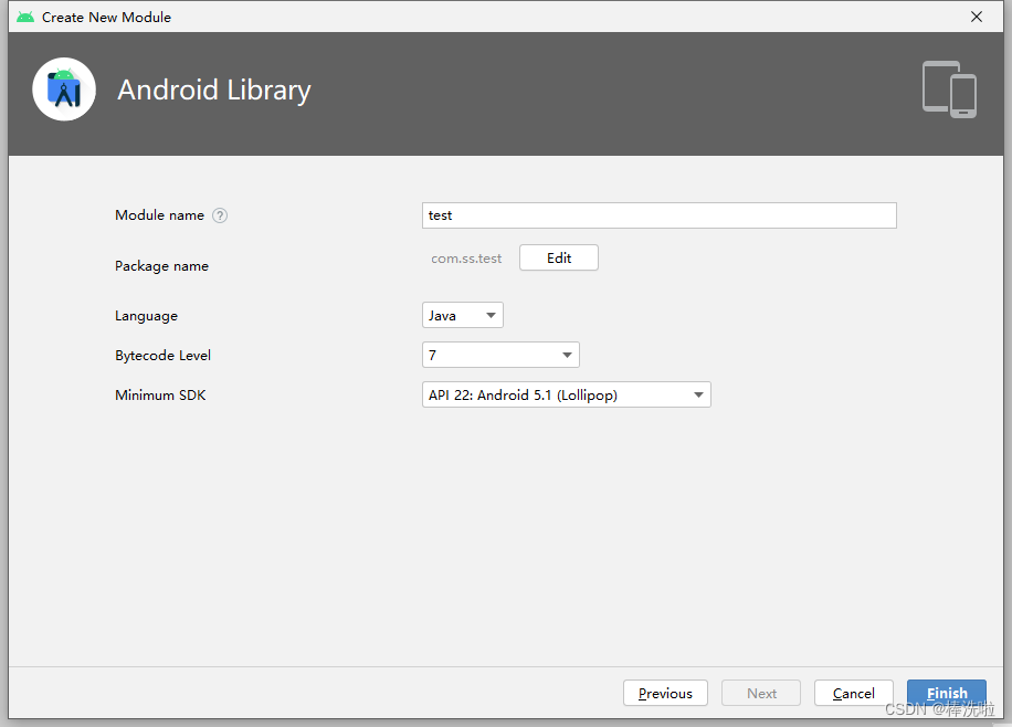 配置模块名以及模块最低支持的Android SDK版本等信息,然后点击Finish完成Module创建。