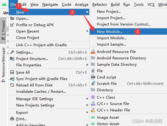 将编辑器文件视图切换到Project,选择我们刚创建的Module目录,然后打开其根目录下的build.gradle文件