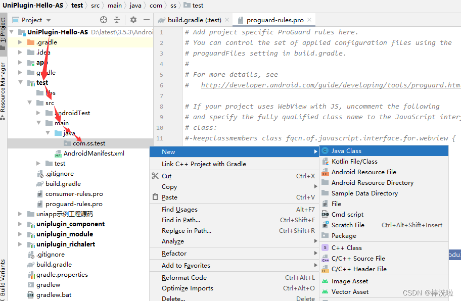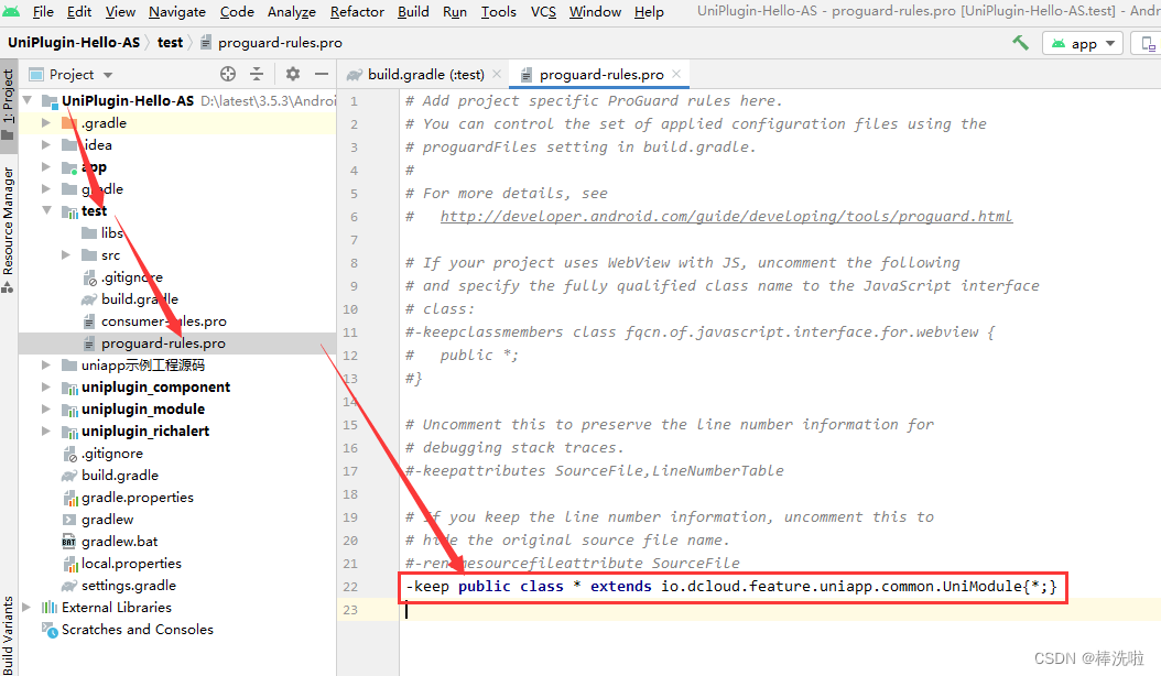打开Module根目录下的proguard-rules.pro文件,在最后一行末尾加入以下代码