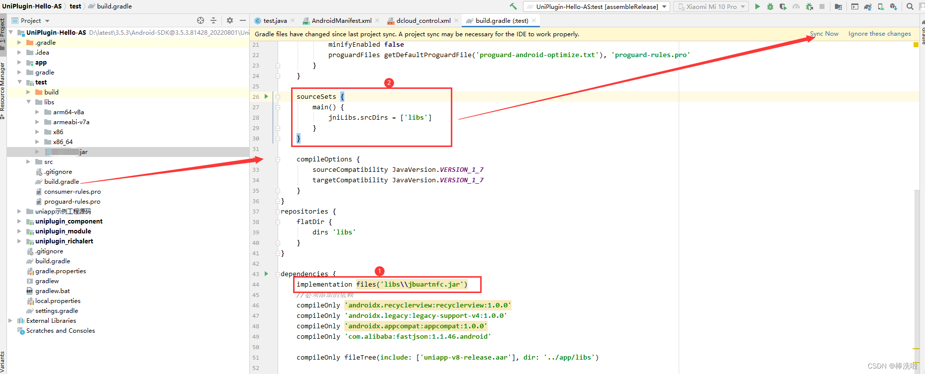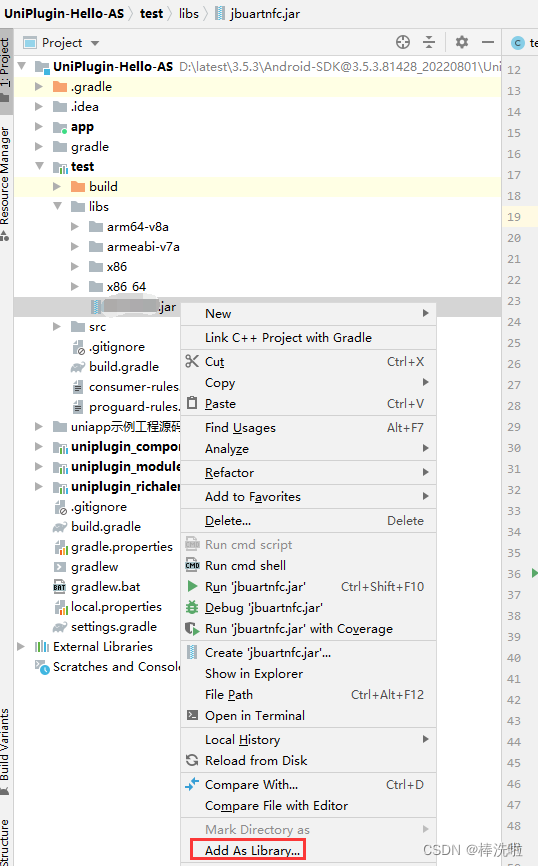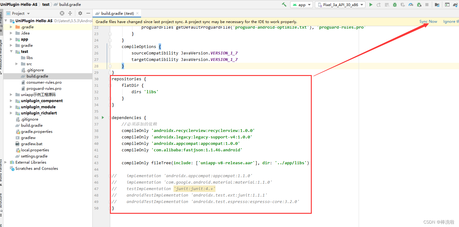 //导入aar需要的配置repositories { flatDir { dirs 'libs' }}dependencies { //必须添加的依赖 compileOnly 'androidx.recyclerview:recyclerview:1.0.0' compileOnly 'androidx.legacy:legacy-support-v4:1.0.0' compileOnly 'androidx.appcompat:appcompat:1.0.0' compileOnly 'com.alibaba:fastjson:1.1.46.android' compileOnly fileTree(include: ['uniapp-v8-release.aar'], dir: '../app/libs')}