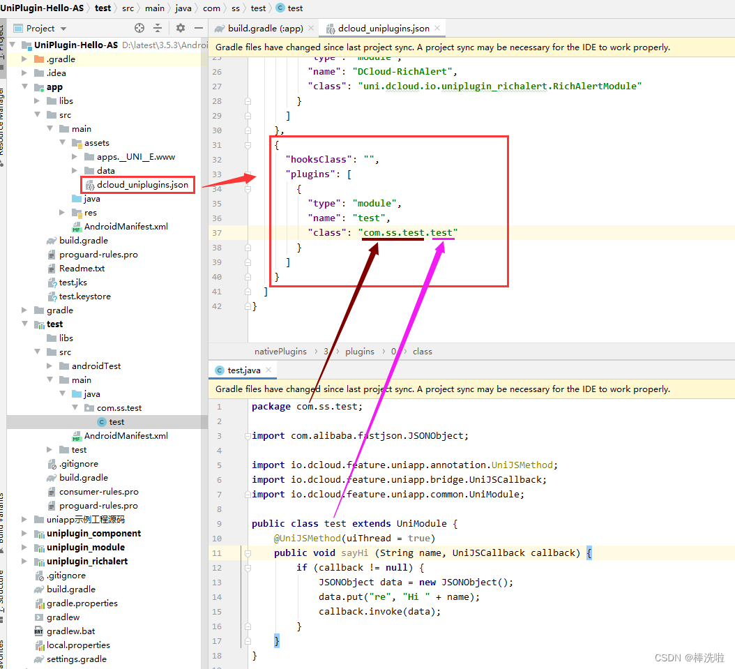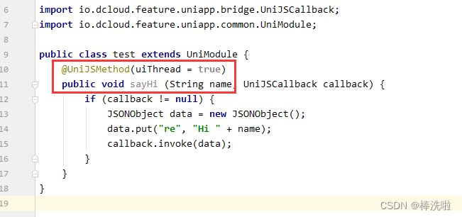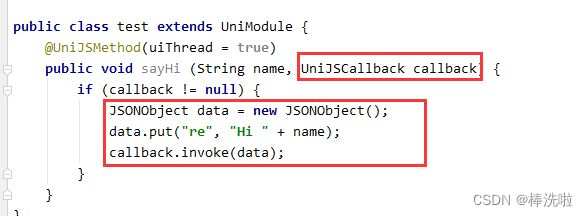 package com.ss.test;import com.alibaba.fastjson.JSONObject;import io.dcloud.feature.uniapp.annotation.UniJSMethod;import io.dcloud.feature.uniapp.bridge.UniJSCallback;import io.dcloud.feature.uniapp.common.UniModule;public class test extends UniModule { @UniJSMethod(uiThread = true) public void sayHi (String name, UniJSCallback callback) { if (callback != null) { JSONObject data = new JSONObject(); data.put("re", "Hi " + name); callback.invoke(data); } }}