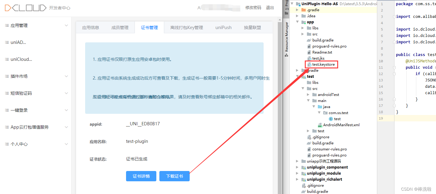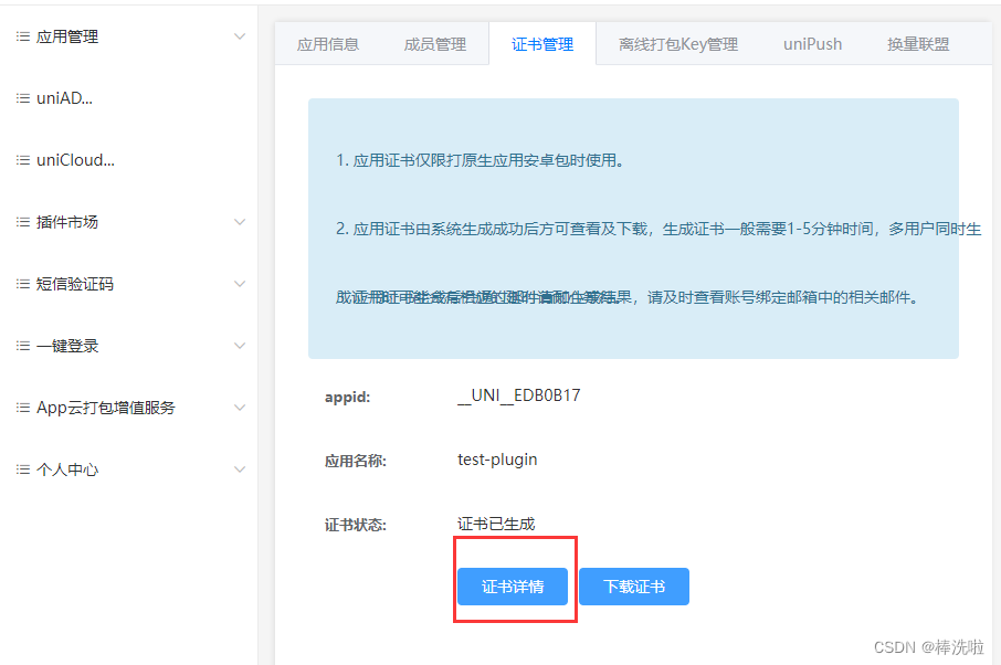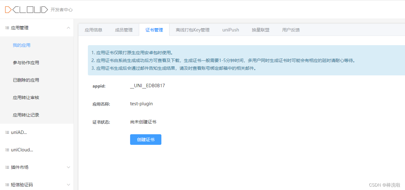 在uniapp 开发者后台应用管理找到对应项目点击名称进去证书配置