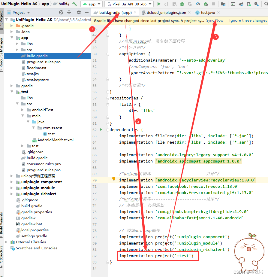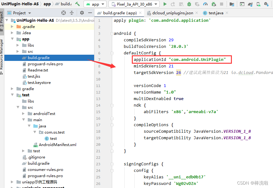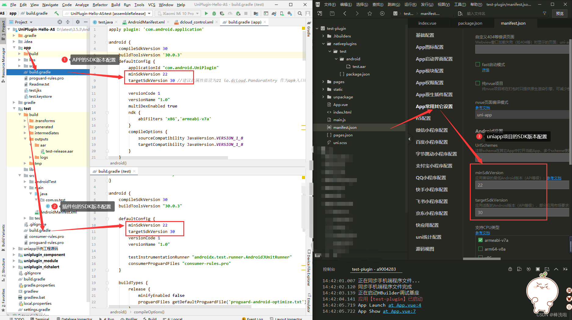 插件包、APP以及uniapp项目的androidSDK版本应该统一一下,避免后续编译打包出错,如图: