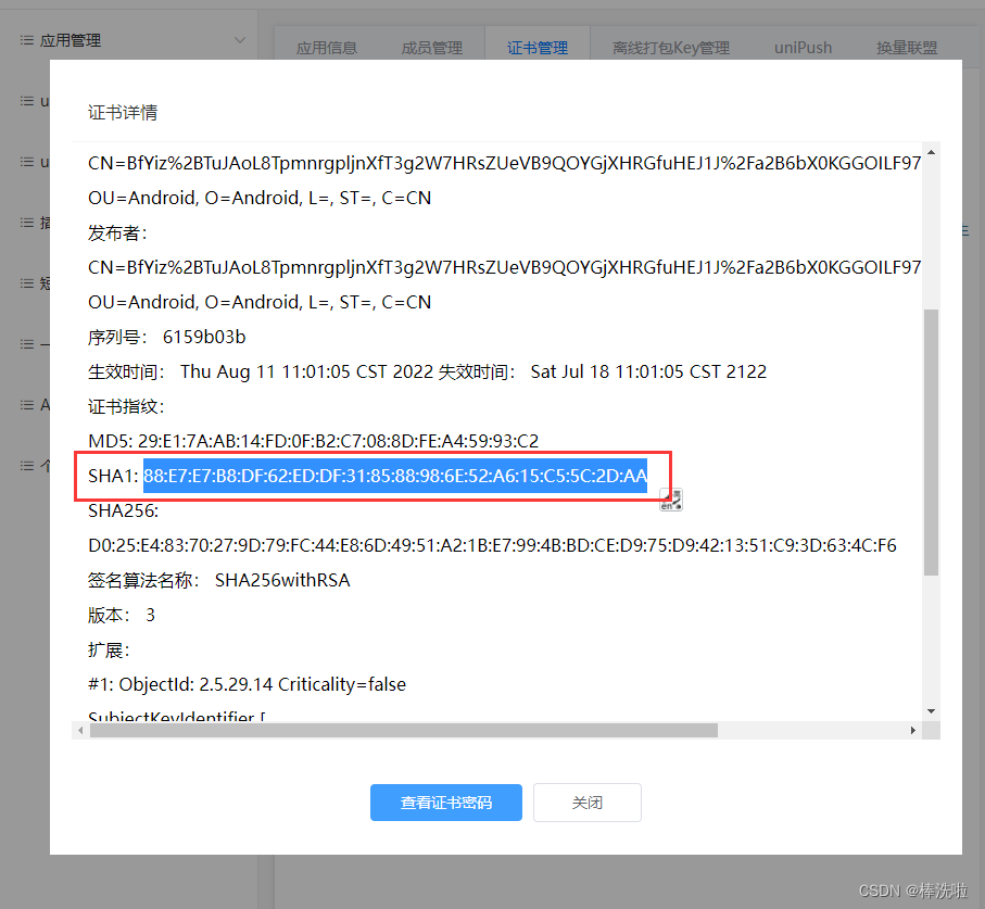 在证书管理页面,证书详情里面获取证书sha1值,如图