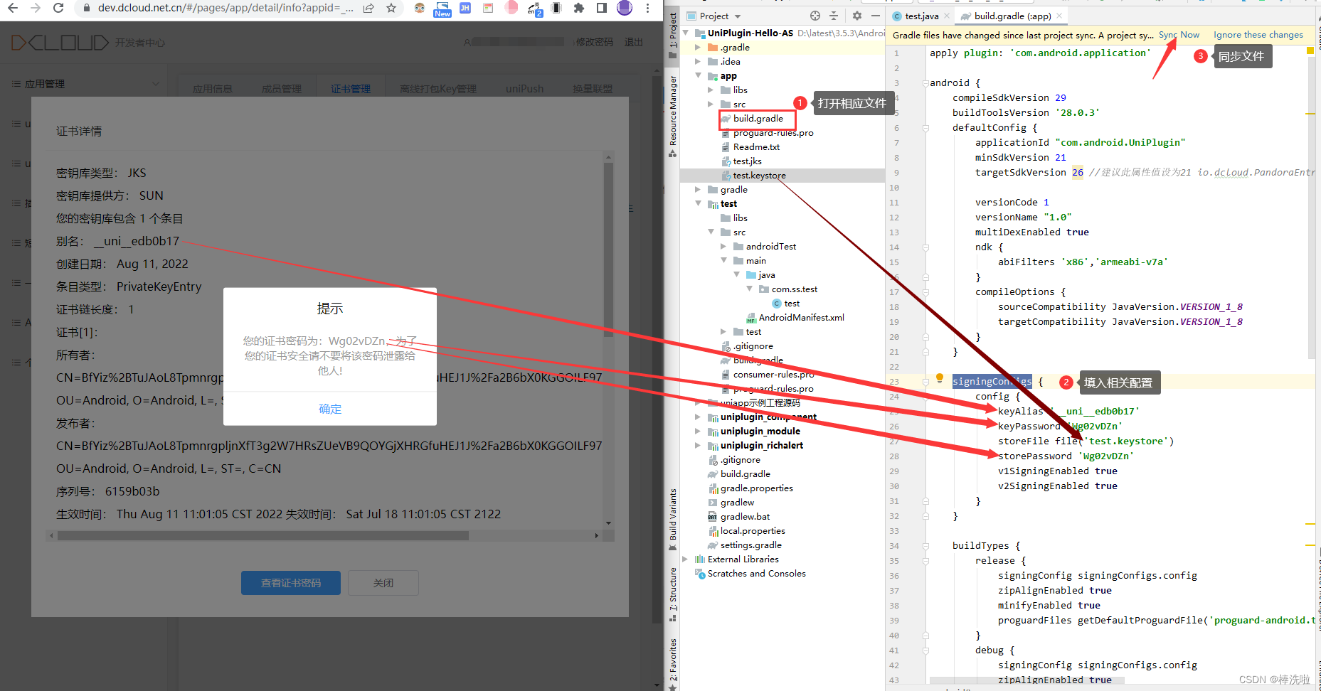 在插件项目app目录下的build.gradle文件中,将信息依次填入文件中的signingConfigs.config配置项,然后点击右上角同步完成配置,具体如图