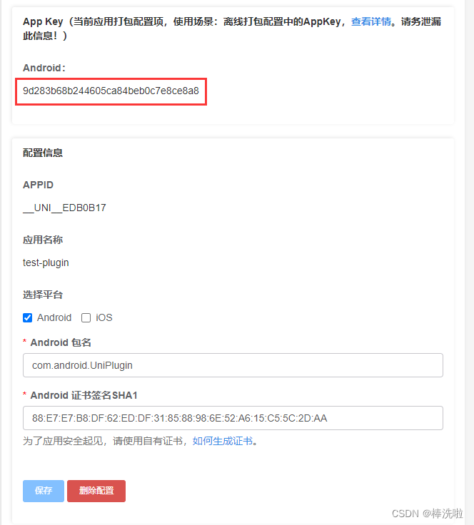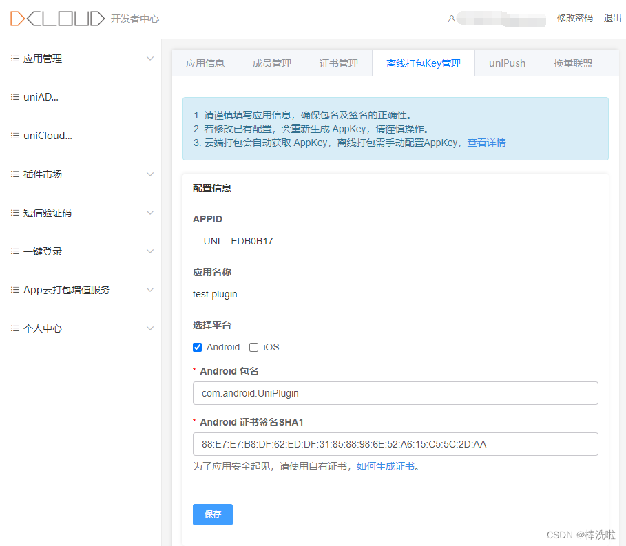 在uniapp应用后台离线打包Key管理页面,将上两步获取的值填入对应输入框,然后点击保存,如图:配置离线打包Key