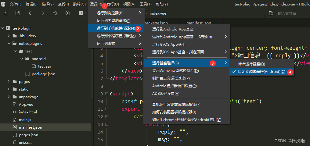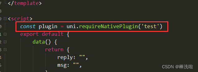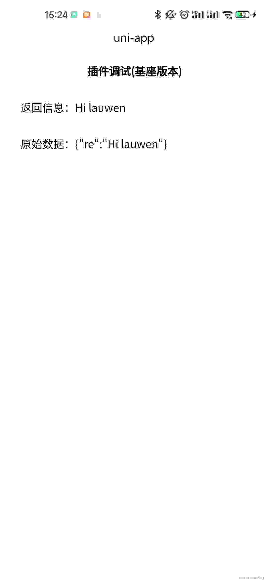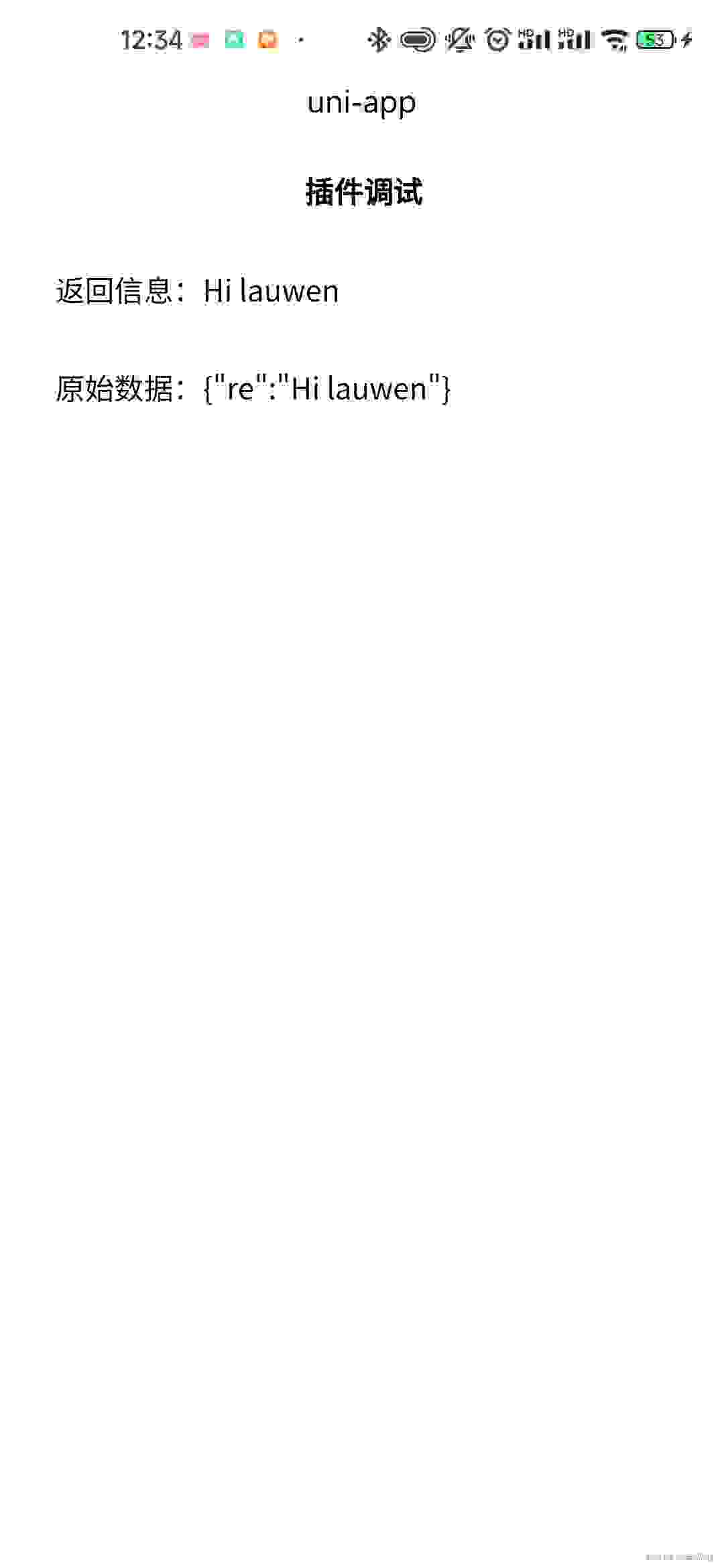 <template><view><view style="width:100vw;text-align: center; font-weight: bold; padding: 15px 0;">插件调试</view><view style="padding: 15px 30px;">返回信息:{{ reply }}</view><view style="padding: 15px 30px;">原始数据:{{ msg }}</view></view></template><script>const plugin = uni.requireNativePlugin('test')export default {data() {return {reply: "",msg: "",}},onLoad() {let that = thisplugin.sayHi("lauwen", function (res) {that.msg = JSON.stringify(res)that.reply = res.re})},methods: {}}</script><style>.content {display: flex;flex-direction: column;align-items: center;justify-content: center;}.logo {height: 200rpx;width: 200rpx;margin-top: 200rpx;margin-left: auto;margin-right: auto;margin-bottom: 50rpx;}.text-area {display: flex;justify-content: center;}.title {font-size: 36rpx;color: #8f8f94;}</style>