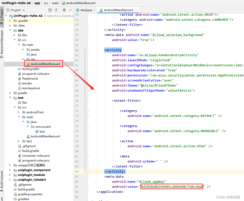 在插件项目app\src\main目录下的AndroidManifest.xml文件中,将上一步生成的离线打包key配置到相应位置,如图