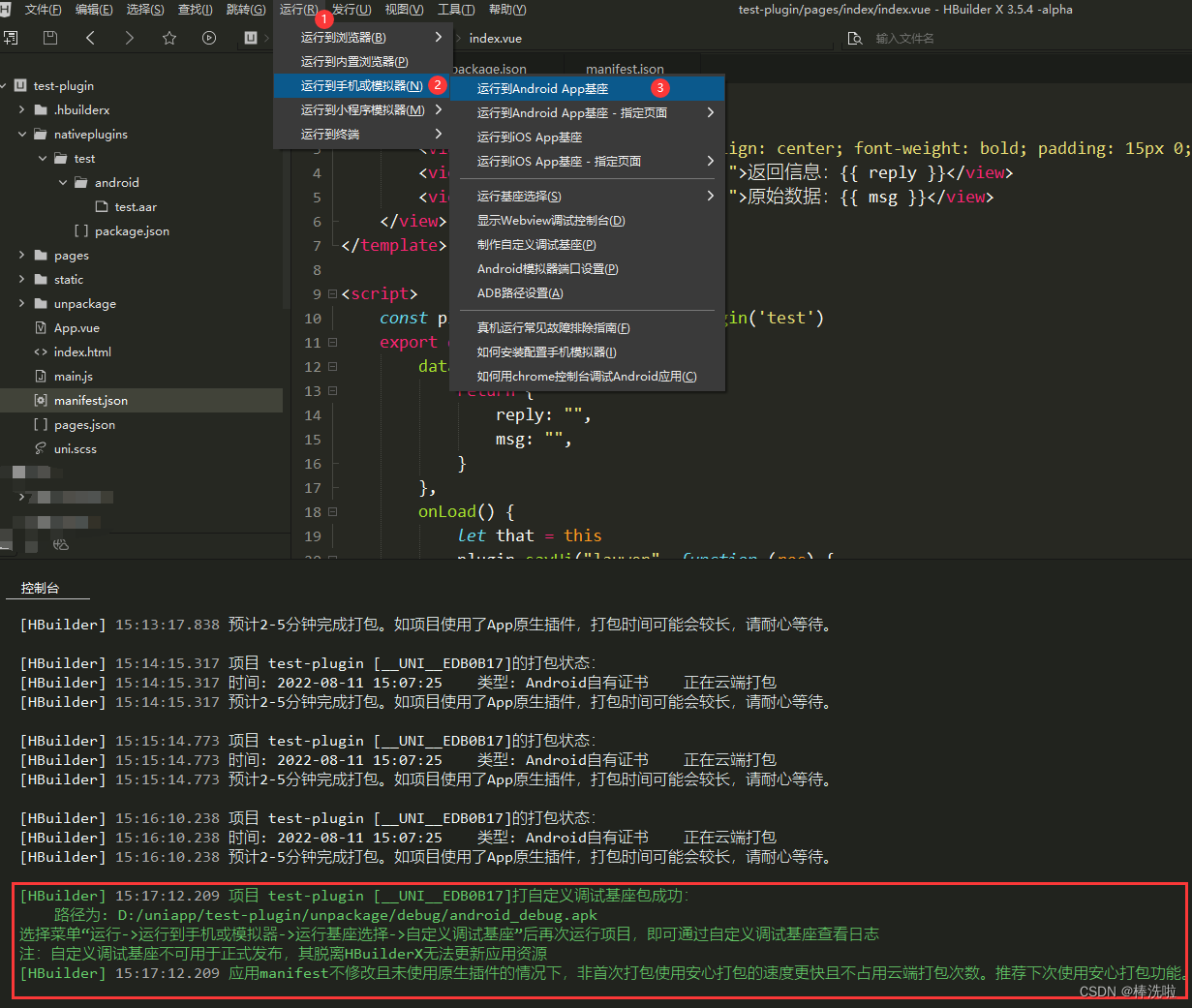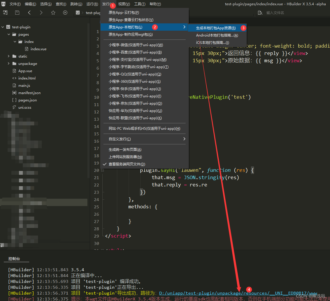 完成相关代码编写后,需要生成uniapp本地打包资源,生成之后控制台会显示相关路径,如下: