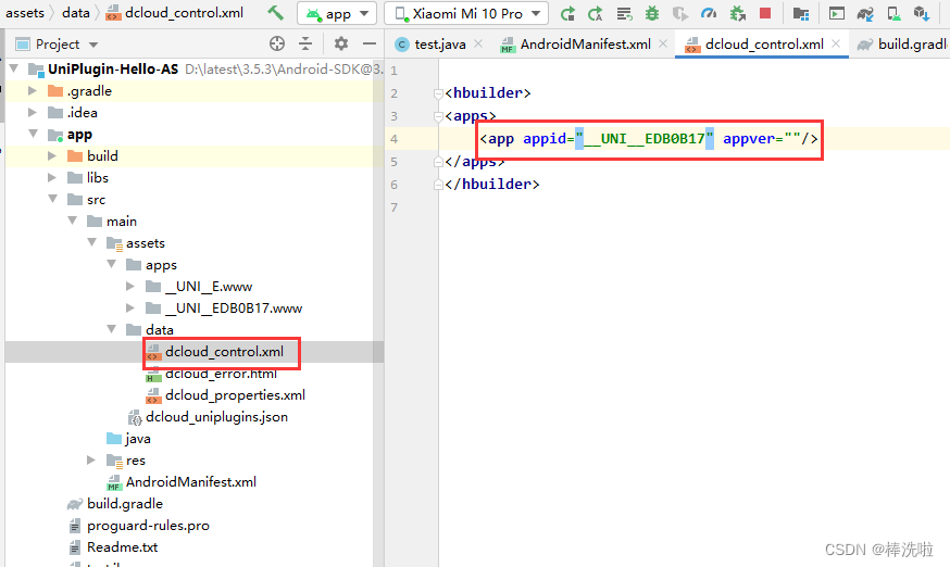 在插件项目app\src\main\assets\data目录下的dcloud_control.xml文件中配置uniapp的appid,具体如下: