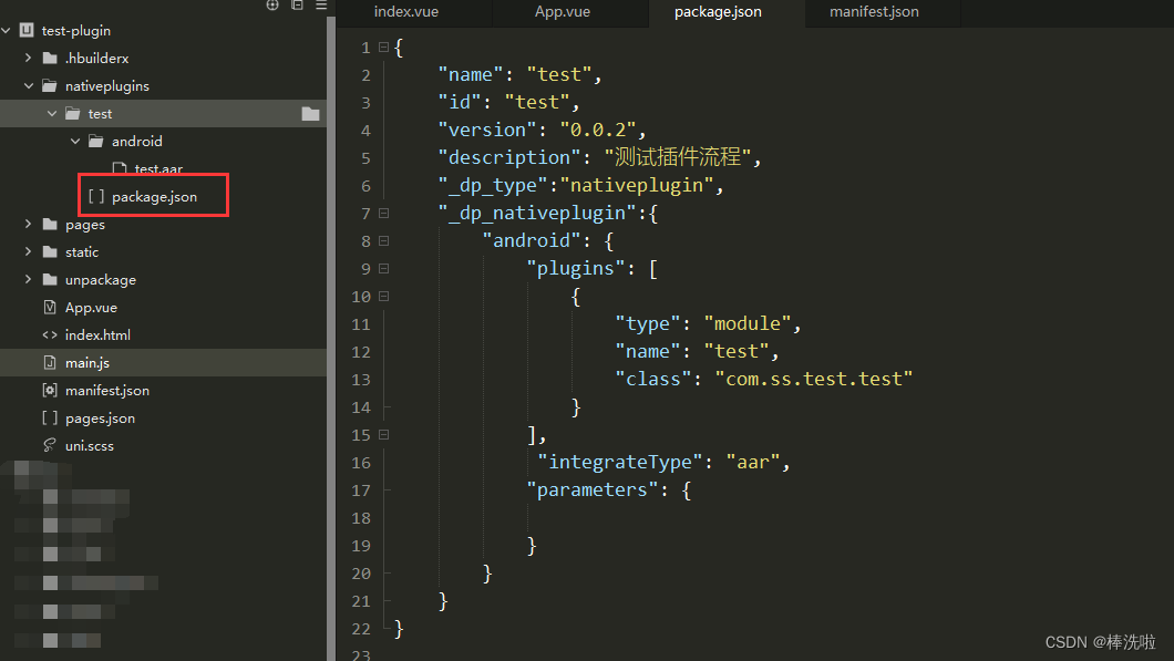 name 和 id建议与插件名统一plugins中的配置与插件配置-注册插件步骤中所填一样dependencies:如果原生插件引入了第三方SDK,需要在此参数中配置,具体可以参考相关官方文档dependencies{ "name": "test", "id": "test", "version": "0.0.2", "description": "测试插件流程", "_dp_type":"nativeplugin", "_dp_nativeplugin":{ "android": { "plugins": [ { "type": "module", "name": "test", "class": "com.ss.test.test" } ],"integrateType": "aar", "parameters": { }, "dependencies": [] } }}