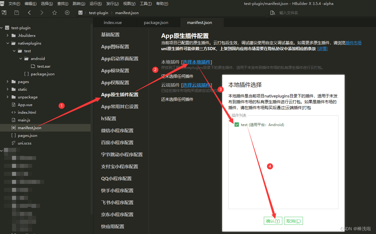 以上介绍了插件开发过程中,集成uniapp项目进行调试的方法;插件开发完成后,需要将原生插件引入uniapp项目中才可以使用。