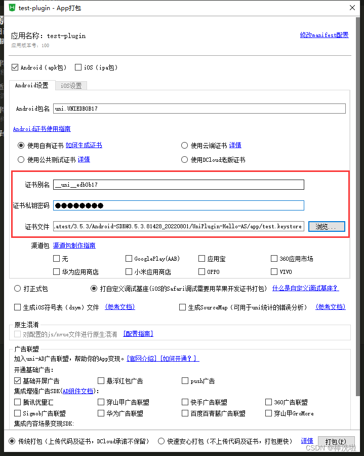 如图三个输入框,分别填入前面在uniapp后台获取的证书以及相关信息,然后执行打包就好