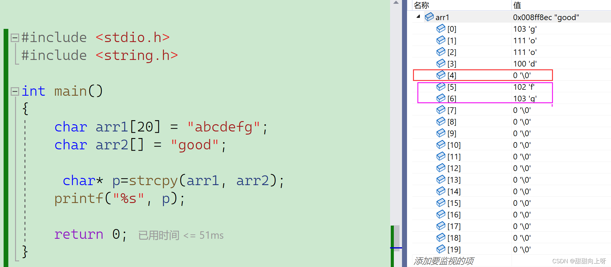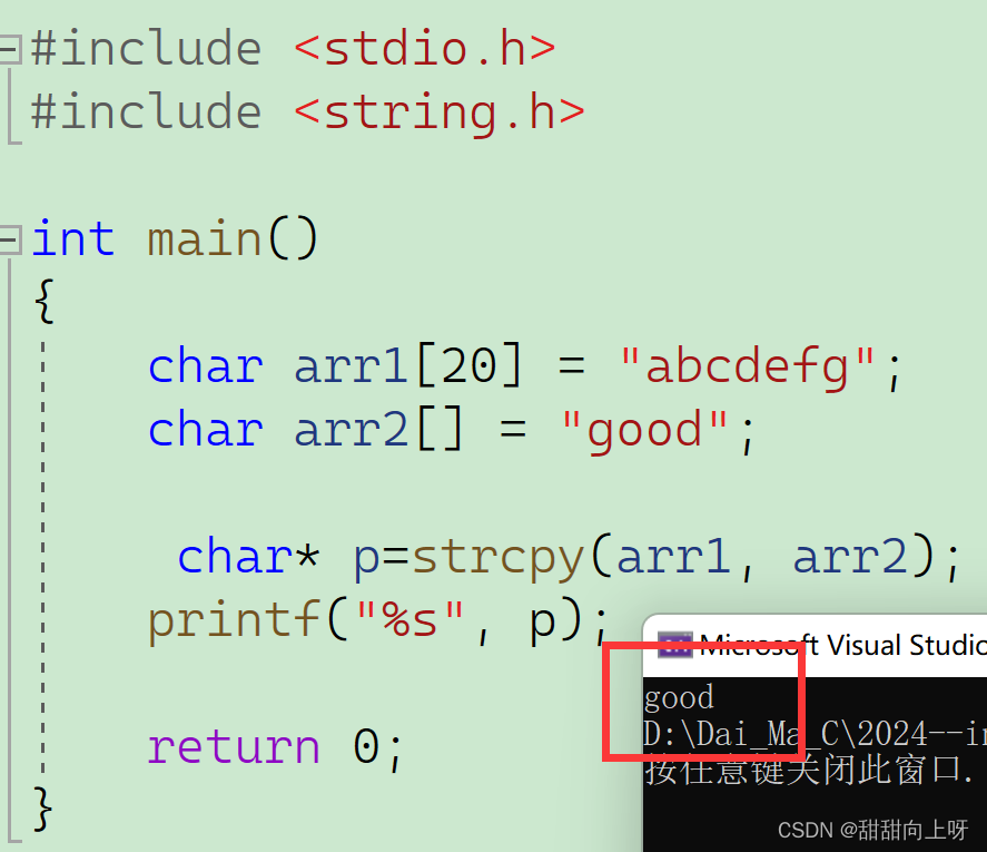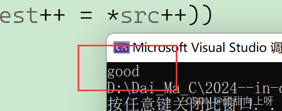 这里为什么打印到good就不打印了呢,是因为把源字符串的'\0'拷贝到了目标空间。