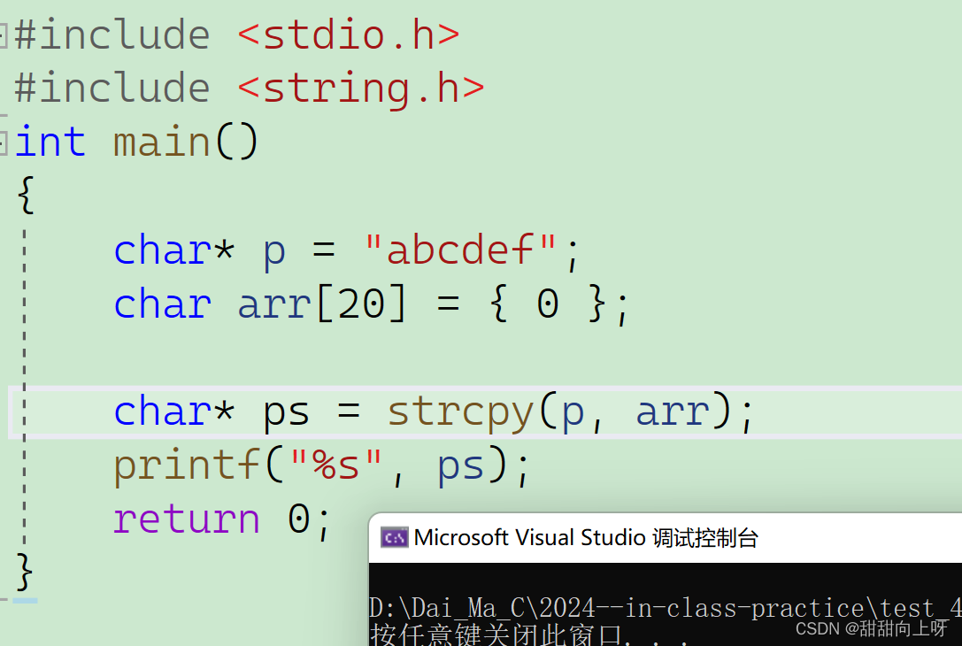 #include <stdio.h>#include <string.h>int main(){char* p = "abcdef";char arr[20] = { 0 };char* ps = strcpy(p, arr); //目标区域不可修改printf("%s", ps);return 0;}