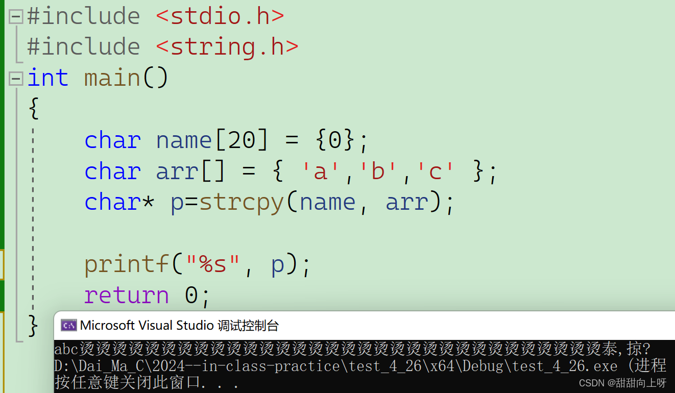 #include <stdio.h>#include <string.h>int main(){char name[20] = {0};char arr[] = { 'a','b','c' };char* p=strcpy(name, arr);printf("%s", p);return 0;}