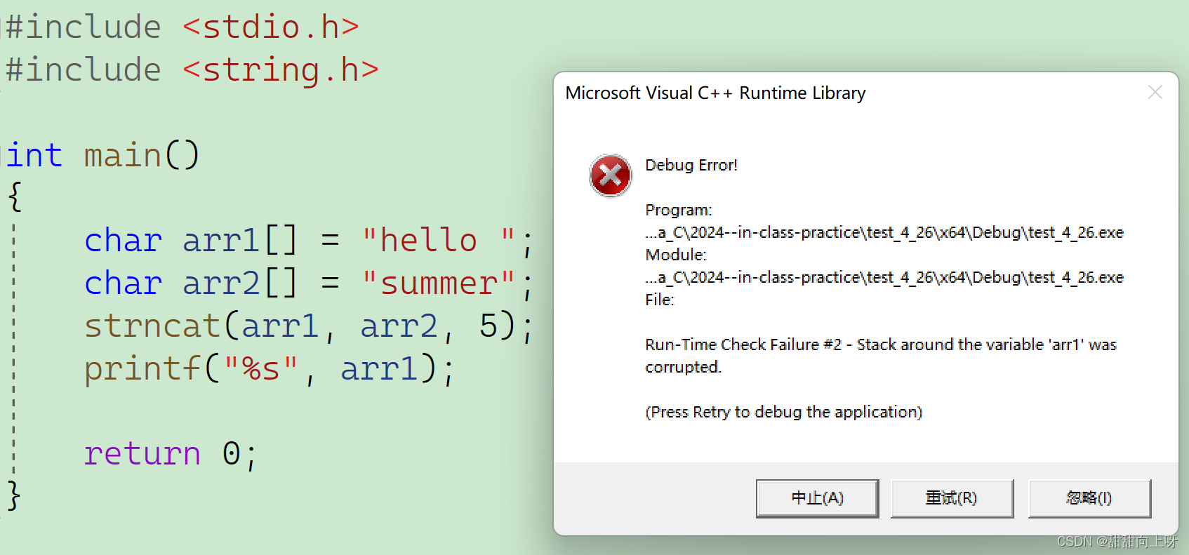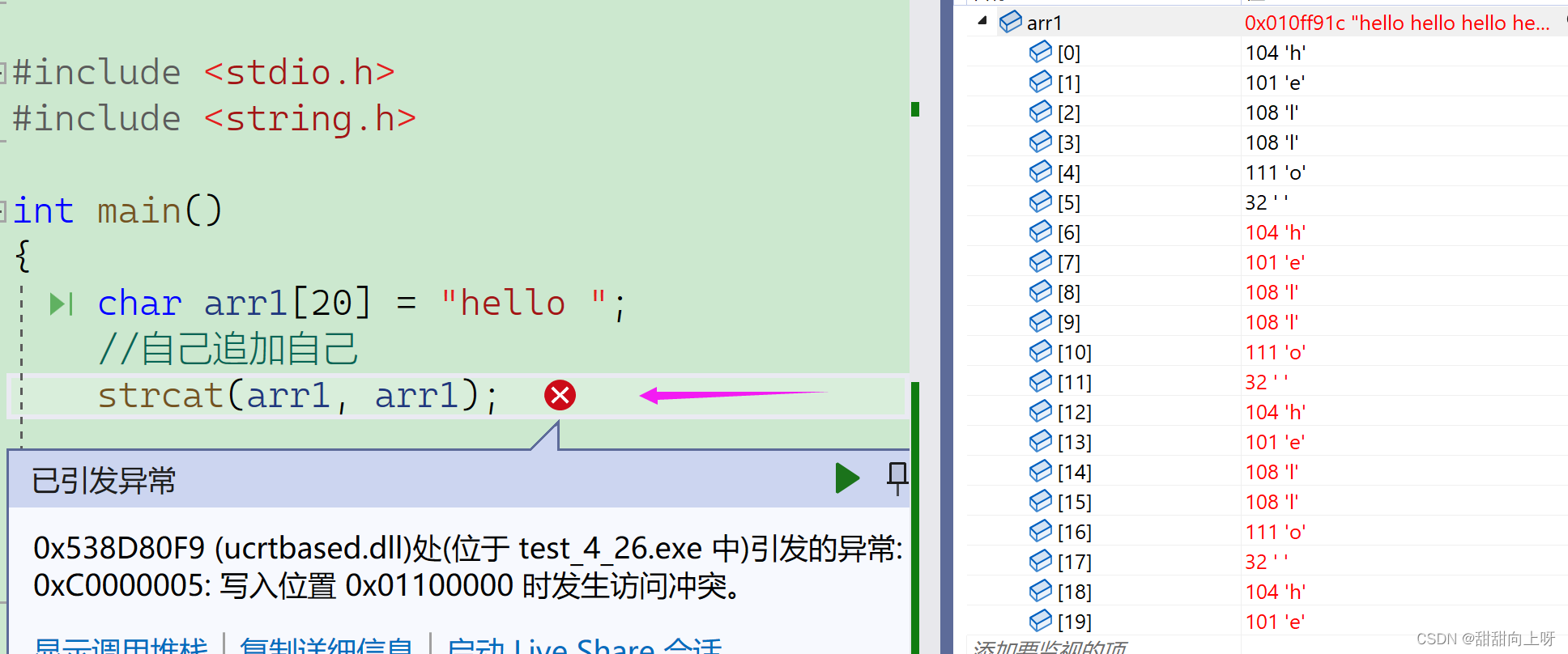 而我们自己模拟实现的strcat函数,无论是在x64还是x86环境下程序都崩溃。(说明我们实现的字符串追加函数跟库函数strcat还是略有差异的)