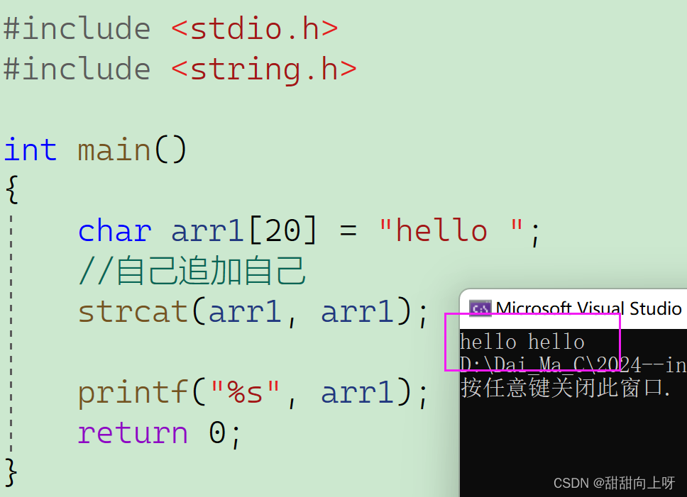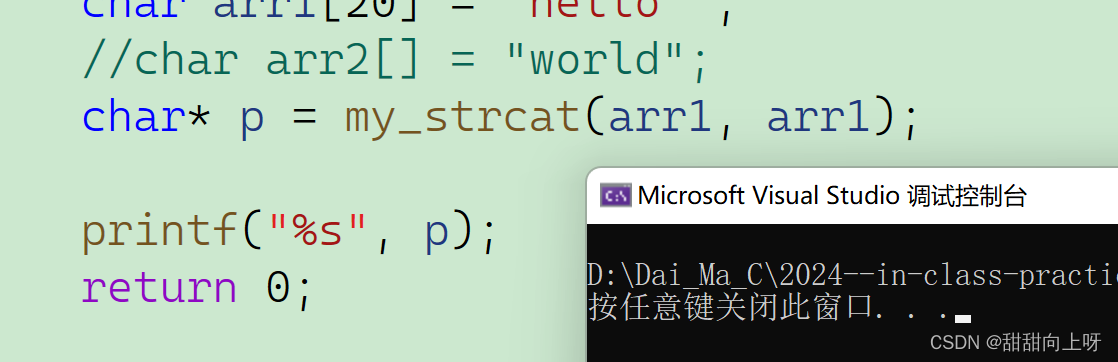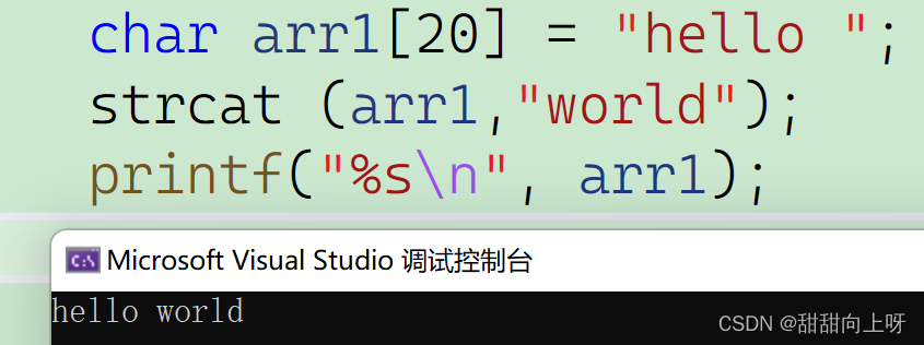 #include <stdio.h>#include <string.h>#include <assert.h>char* my_strcat(char* dest, const char* src){char* ret = dest;assert(dest != NULL);assert(src != NULL);while (*dest){dest++;}while ((*dest++ = *src++)){;}return ret;}int main(){char arr1[20] = "hello ";char arr2[] = "world";char* p = my_strcat(arr1, arr2);printf("%s", p);return 0;}