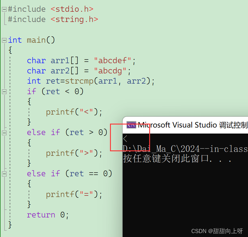 #include <stdio.h>#include <string.h>int main(){char arr1[] = "abcdef";char arr2[] = "abcdg";int ret=strcmp(arr1, arr2);if (ret < 0){printf("<");}else if (ret > 0){printf(">");}else if (ret == 0){printf("=");}return 0;}