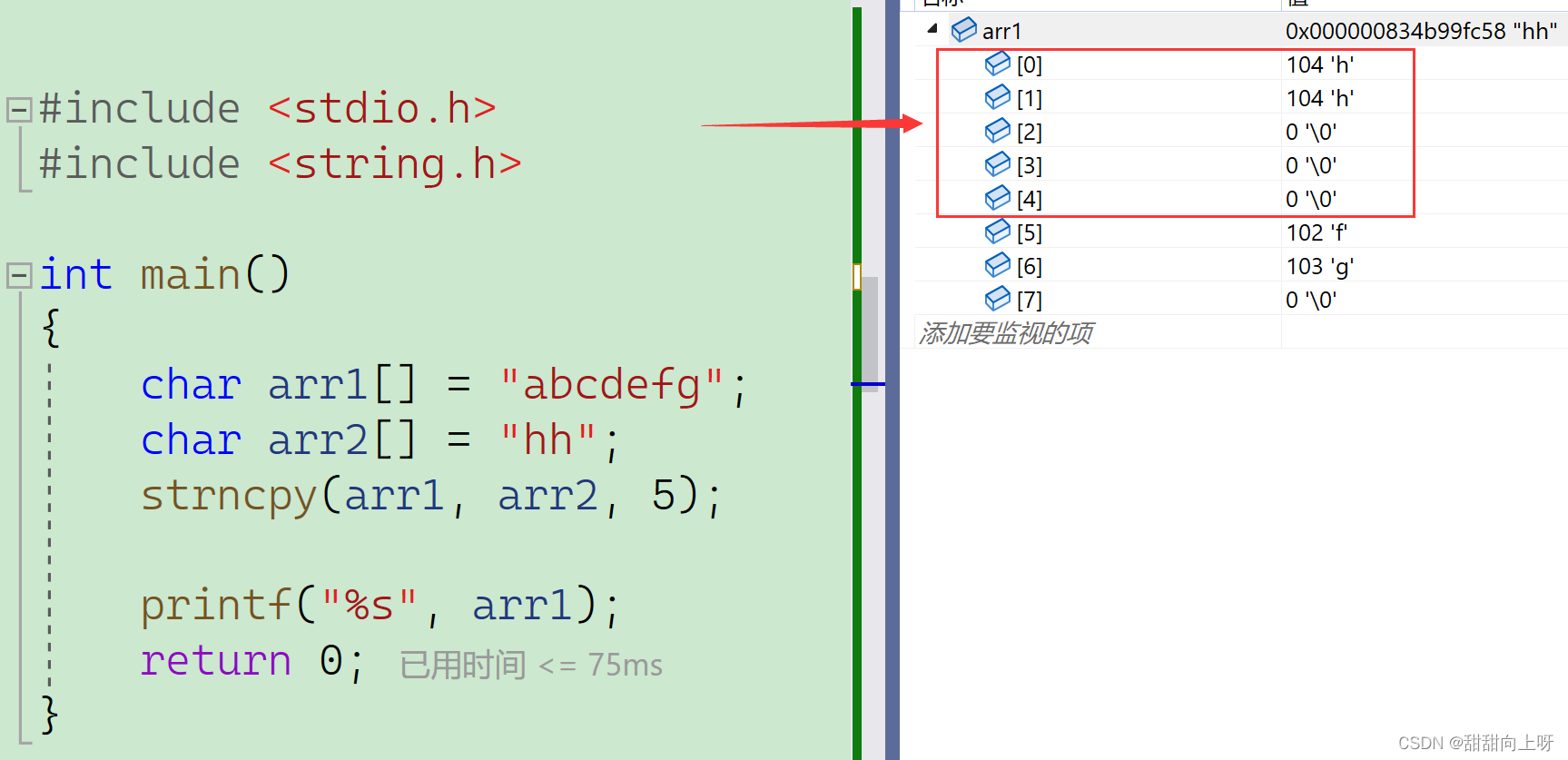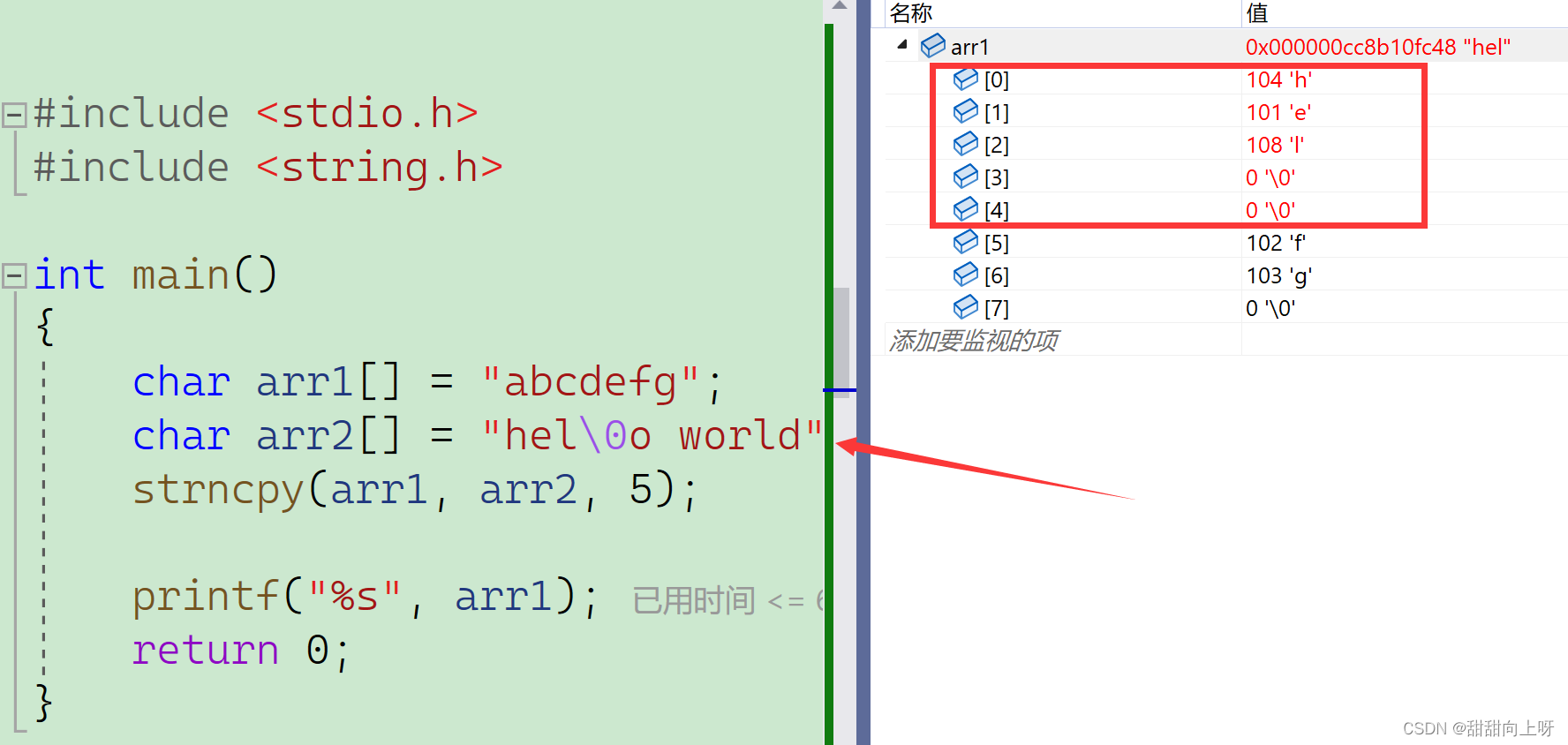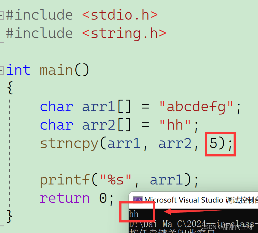 #include <stdio.h>#include <string.h>int main(){char arr1[] = "abcdefg";char arr2[] = "hello world";strncpy(arr1, arr2, 5);printf("%s", arr1);return 0;}