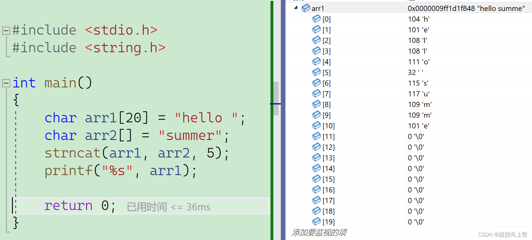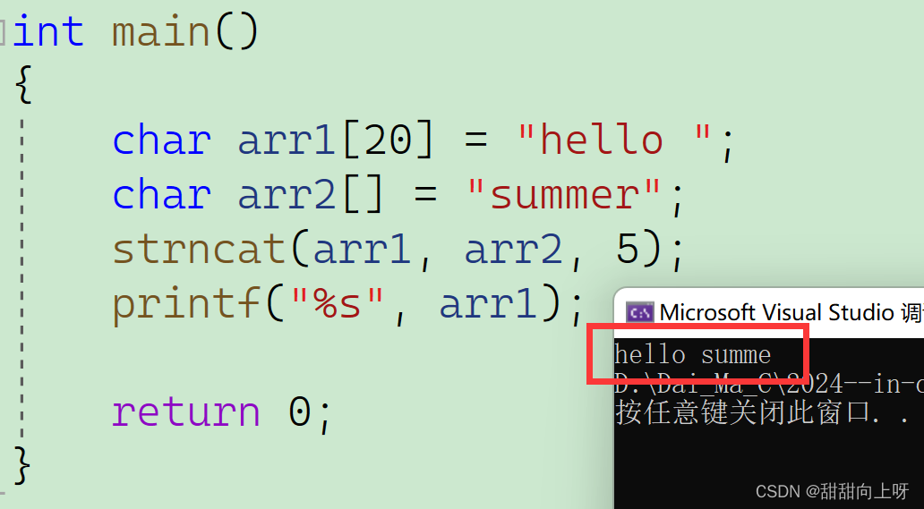 #include <stdio.h>#include <string.h>int main(){char arr1[20] = "hello ";char arr2[] = "summer";strncat(arr1, arr2, 5);printf("%s", arr1);return 0;}