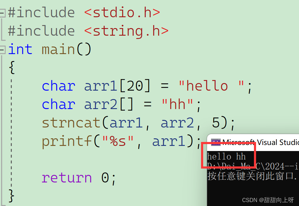 #include <stdio.h>#include <string.h>int main(){char arr1[20] = "hello ";char arr2[] = "hh";strncat(arr1, arr2, 5);printf("%s", arr1);return 0;}