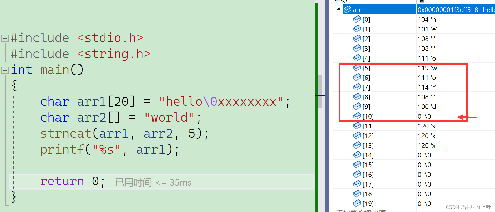 #include <stdio.h>#include <string.h>int main(){char arr1[20] = "hello\0xxxxxxxx";char arr2[] = "world";strncat(arr1, arr2, 5);printf("%s", arr1);return 0;}
