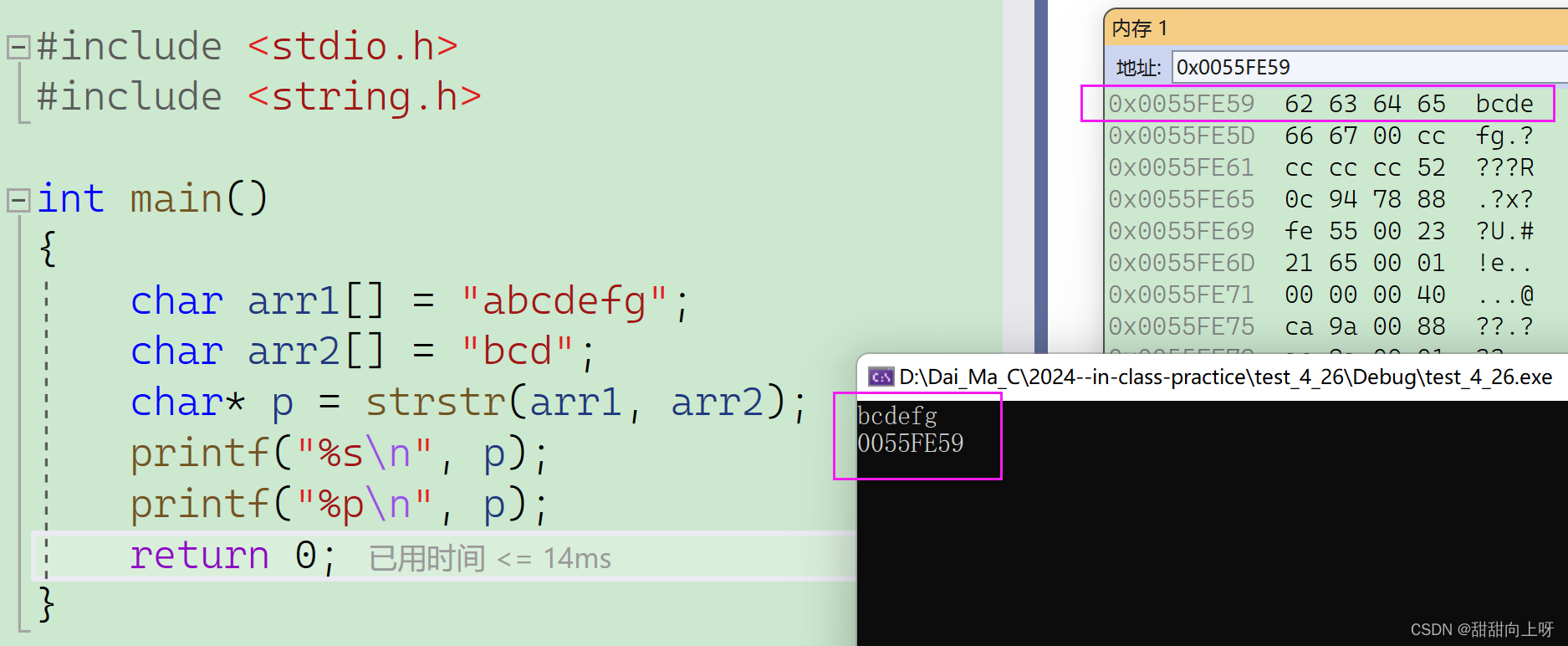 #include <stdio.h>#include <string.h>int main(){char arr1[] = "abcdefg";char arr2[] = "bcd";char* p = strstr(arr1, arr2);printf("%s\n", p);printf("%p\n", p);return 0;}