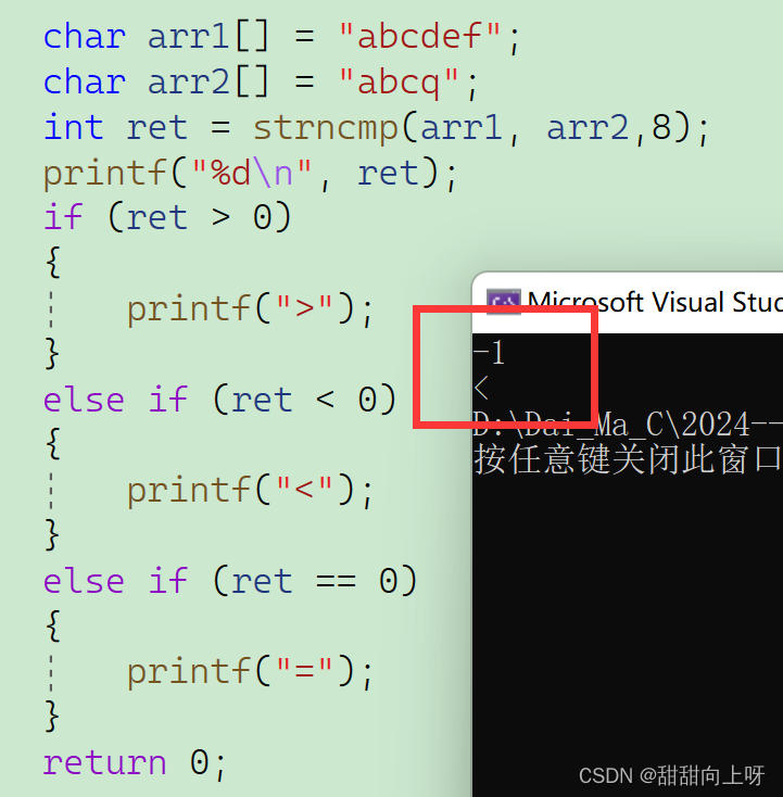 #include <stdio.h>#include <string.h>int main(){char arr1[] = "abcdef";char arr2[] = "abcq";int ret = strncmp(arr1, arr2,4);printf("%d\n", ret);if (ret > 0){printf(">");}else if (ret < 0){printf("<");}else if (ret == 0){printf("=");}return 0;}