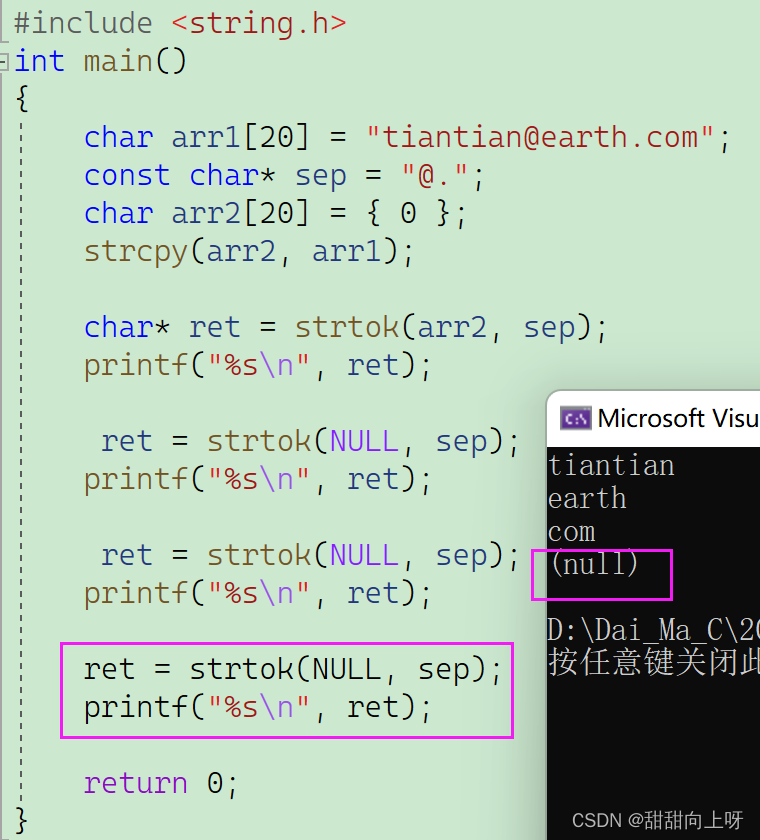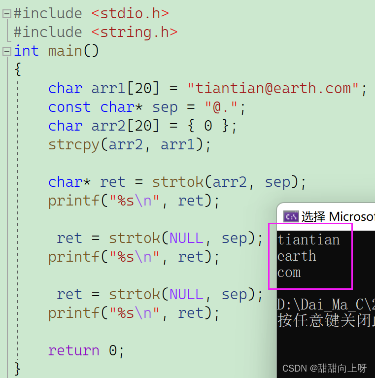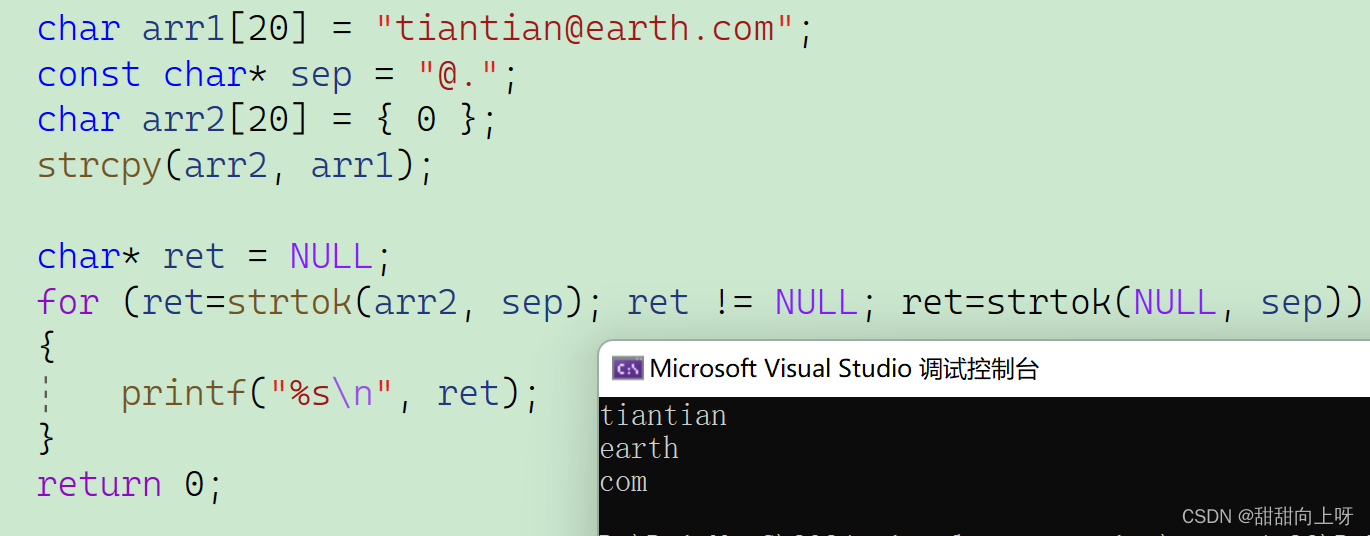 #include <stdio.h>#include <string.h>int main(){char arr1[20] = "tiantian@earth.com";const char* sep = "@.";char arr2[20] = { 0 };strcpy(arr2, arr1);char* ret = NULL;for (strtok(arr2, sep); ret != NULL; strtok(NULL, sep)){printf("%s\n", ret);}return 0;}