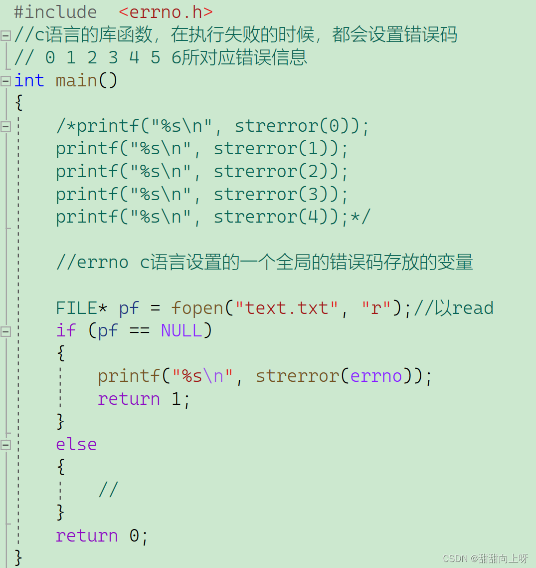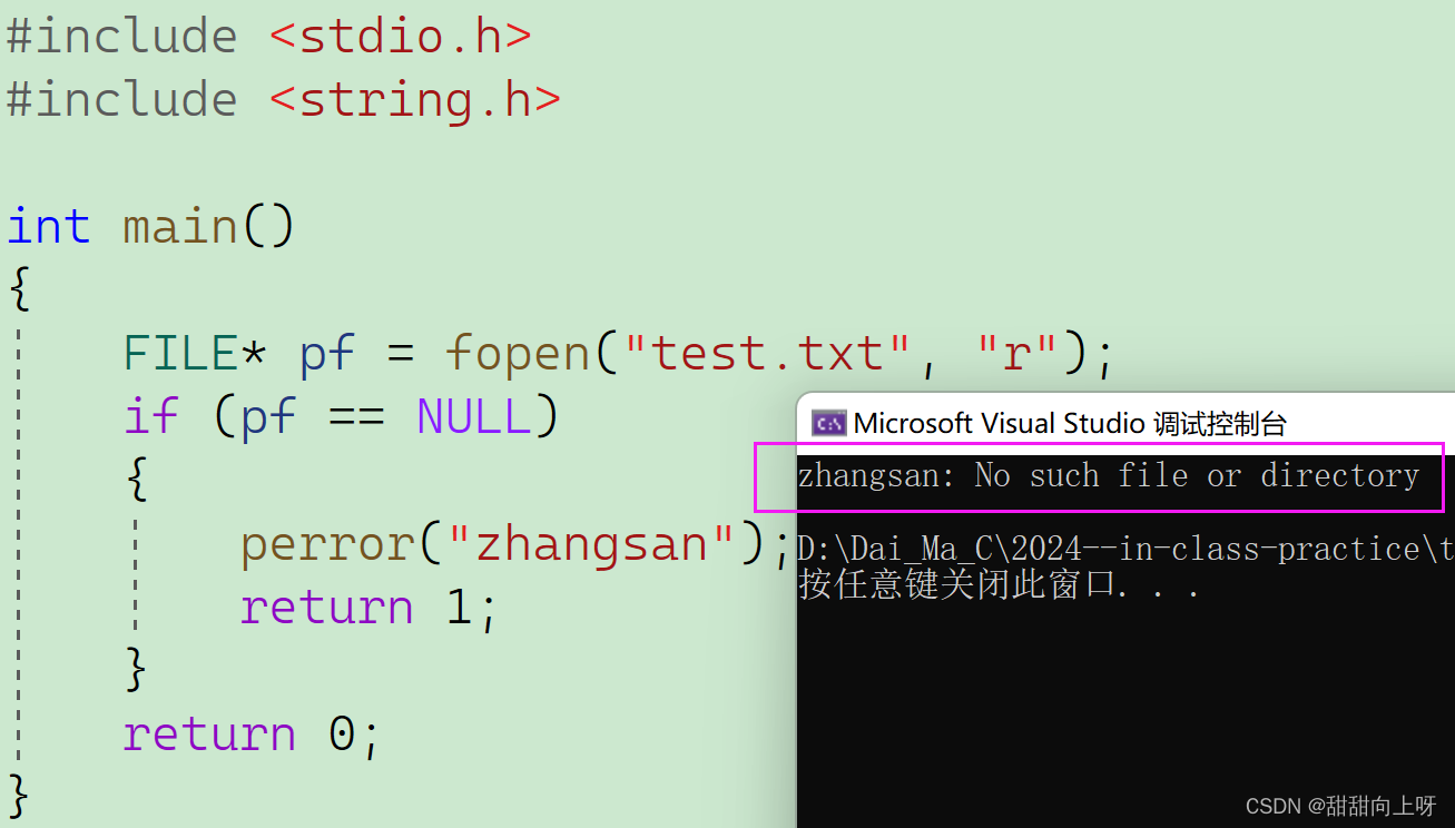 #include <stdio.h>#include <string.h>int main(){FILE* pf = fopen("test.txt", "r");if (pf == NULL){perror("zhangsan");return 1;}return 0;}