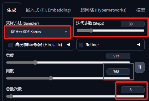 接着来到参数部分,采样方法选择 DPM++ SDE Karras ,迭代步数改为 30 ,高度改为 768,总批次数改为 3,这样可以一次跑三张图出来。