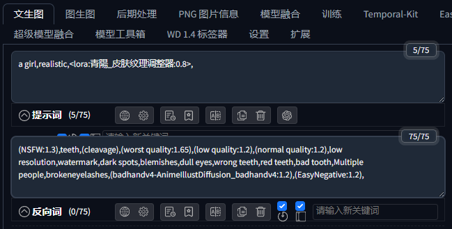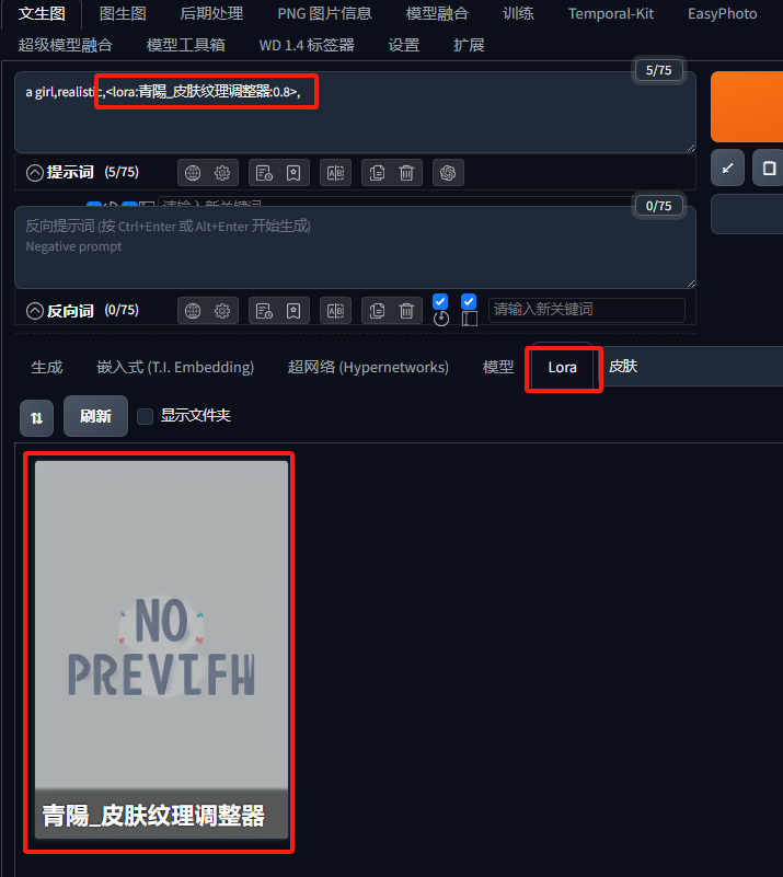 接着我们在同样的数据上加上皮肤质感,首先先选择Lora模型,并且把权重调低一点,改为0.8。