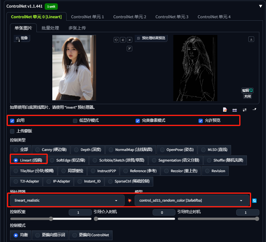 接下来找到 ControNet ,上传一张我们刚选中的一张图片,勾选完美像素模式、允许预览,控制类型选择Lineart(线稿),预处理器选择lineart_realistic。做这一步的目的是为了等一下生成出来的图和我们这张图有高度的相似度。