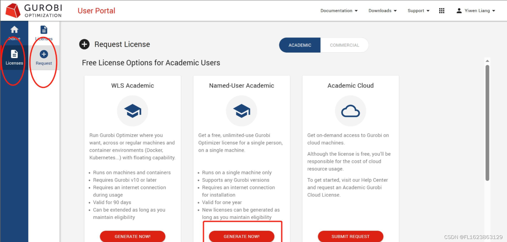 注册完毕以后,进入账号界面,在左侧选择license,点击request,选择Named-User Academic,如下图所示:
