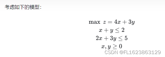 % 定义变量x = sdpvar(1);y = sdpvar(1);% 定义约束条件cons = [x+y<=2, 2*x+3*y<=5, x>=0, y>=0];% 定义目标函数z = 3*x + 4*y;% 进行求解result = optimize(cons, -z)% 求解结束,若求解成功,则输出x,y,z的值,否则输出错误信息if result.problem == 0 value(x),value(y),value(z)else disp(result.info)end